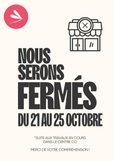 Nous serons fermés cette semaine du 21 au 25 octobre inclus, suite aux différents travaux réalisés dans le centre commercial. Merci de votre compréhension.